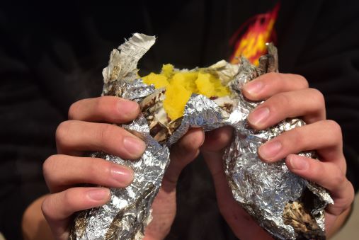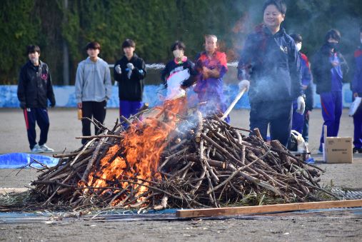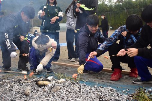 3クラスそれぞれに用意された大きな焚火によって、一人ひとつずつ渡されたサツマイモのほか、ウインナー、マシュマロなどが生徒によって焼かれ、 生徒同士は親睦をより一層深めました。