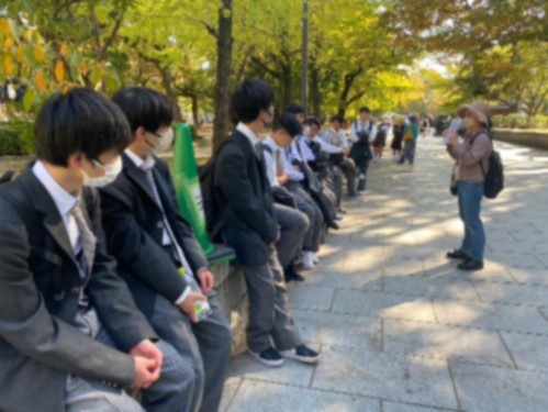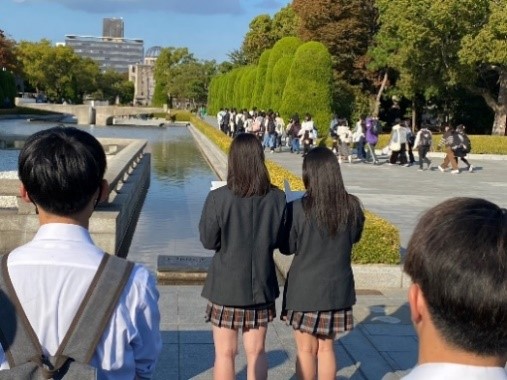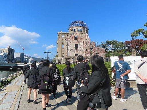夏日を思わせるような暑い日差しの中、広島平和記念公園では各クラス2班に分かれ、ガイドさんの案内のもと平和学習を行いました。